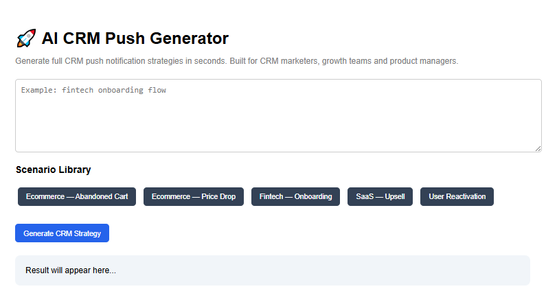 Just describe the user behavior and AI generates a full CRM push flow including timing, messaging and campaign goals.