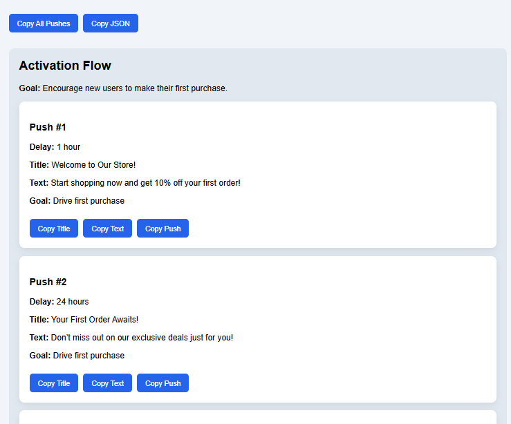Create full push notification flows for SaaS, fintech and ecommerce in seconds.